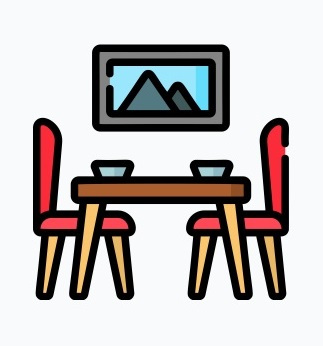 Table et chaises pour tout le monde, nappe, vaisselle et couverts pour tous les repas...